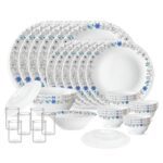 Larah by Borosil Silk Series Blue Iris Opalware Dinner Set with Vision Glass | 35pcs for Family of 6 | Microwave & Dishwasher Safe | Bone-Ash Free | Crockery for Dining & Gifting | White, Plate & Bowl